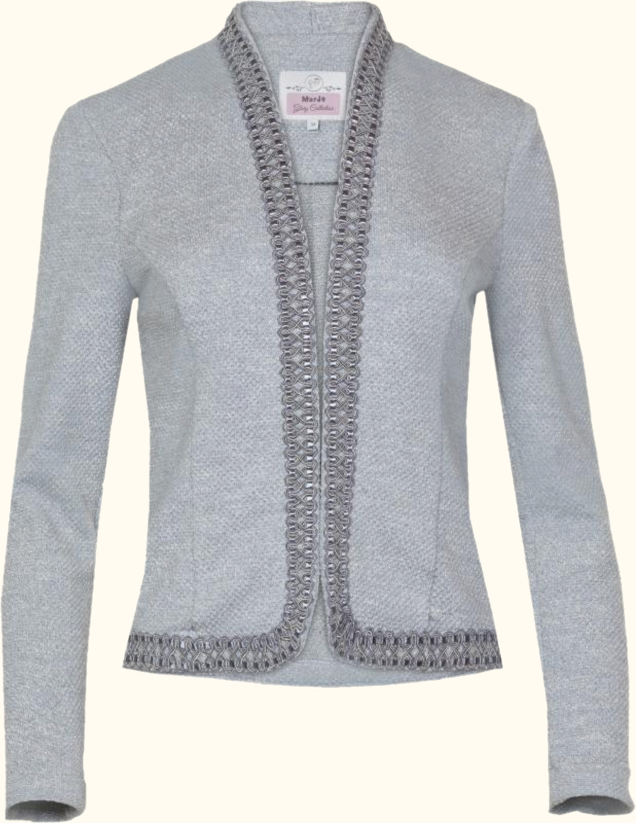 Elegante Damenjacke mit Haken-Verschluss, eine breite silbern glänzende Bordüre umrahmt den grauen Stoff,