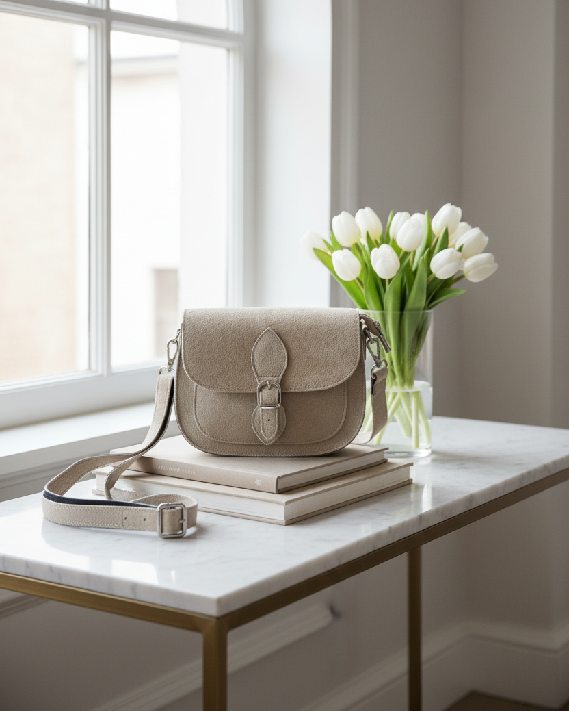 Traditionell anmutende Tasche in 21 x 18 cm Größe, mit Magnet-Schnallenverschluss vorne und Ösen seitlich zum Abnehmen des beigepacken Schulterriemens. Kleines Einsteckfach unter der Verschlussklappe für Kleinigkeiten, Innenfach durch Reissverschluss geschlossen.
